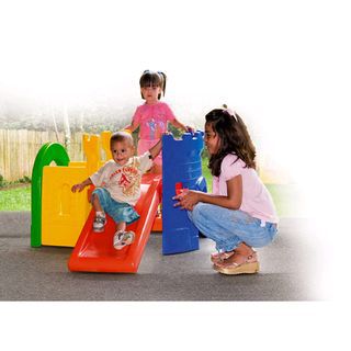 PLayground colorido em formato de castelo altura 0,70m, plataforma superior interna e escorregador pequeno Túnel na parte inferior e paredes com desenhos de tijolos, torres e janelas.